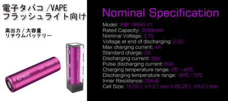 Efest 18650 3000mAh 35A 3.7V サイズ: 直径18.5 ±0.2mm x 長さ65.2 ±0.2mm フラットトップタイプ(突起無し) Efest純正1本用プラスチックケース入り 日本国内にて全 […] >>Efest IMR 18650 3000mAh 35A flat top battery ¥1,380 (税込)
